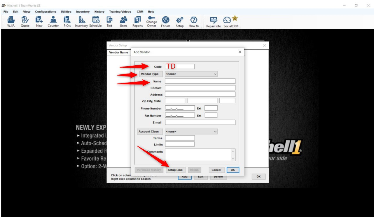 - Enter the Code "TD", select the "Vendor Type", and input the "Name" click "Setup Link"